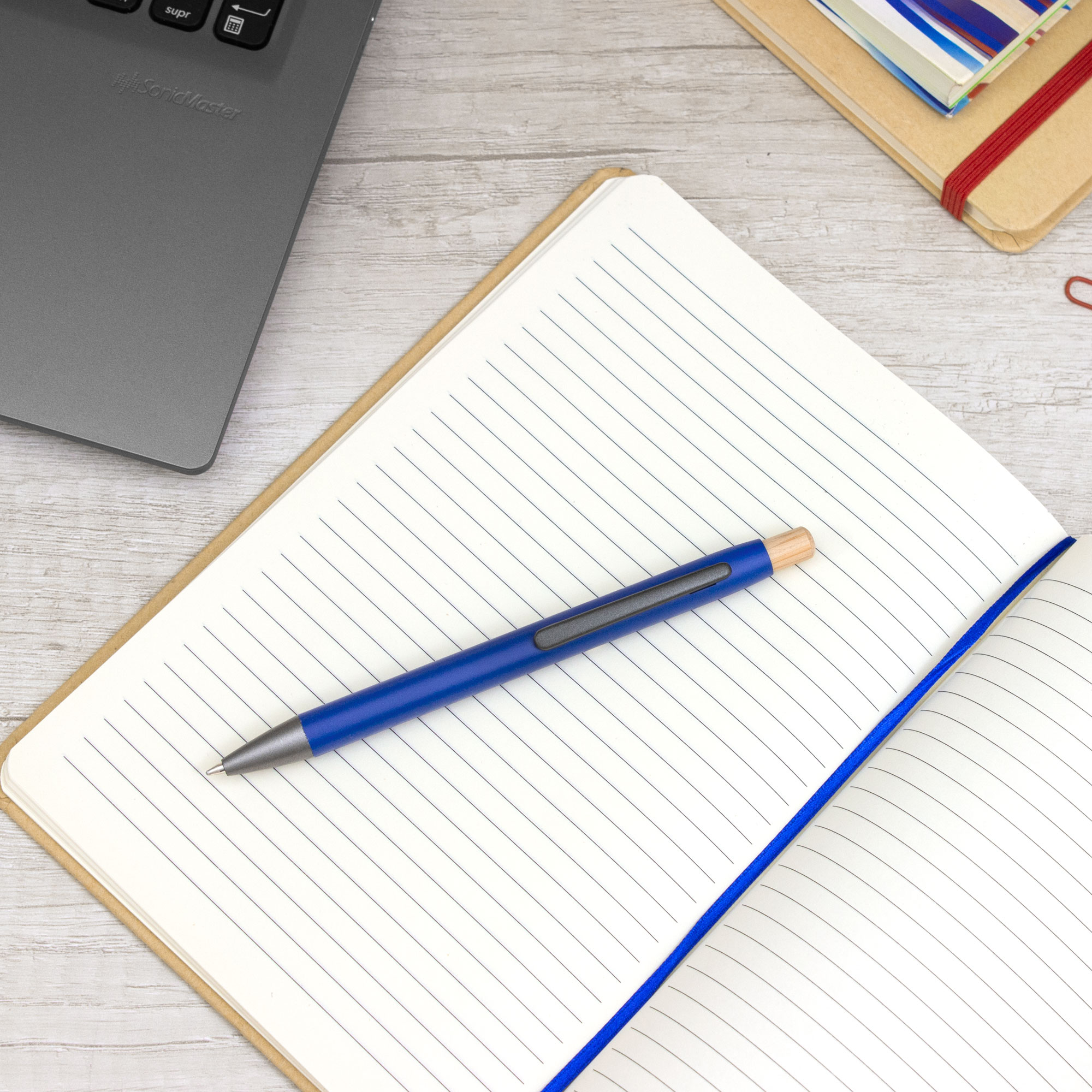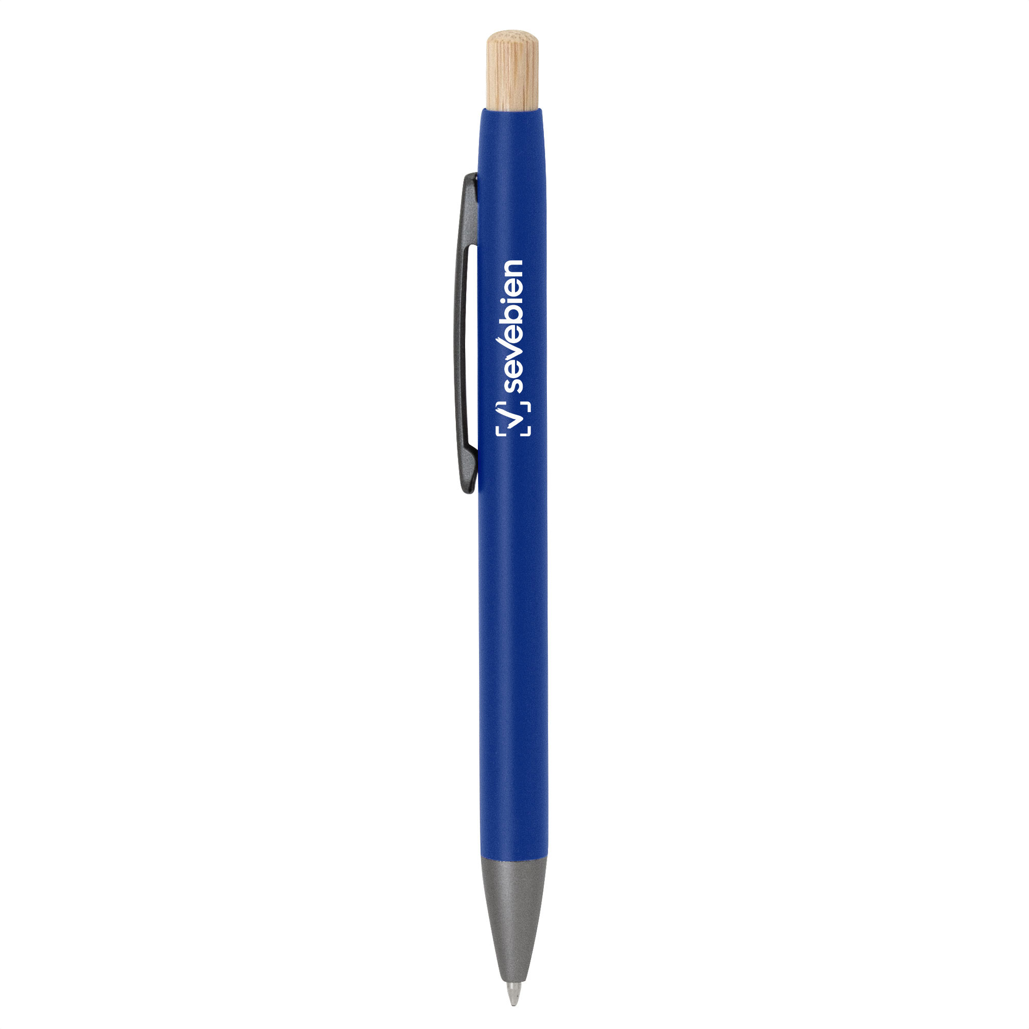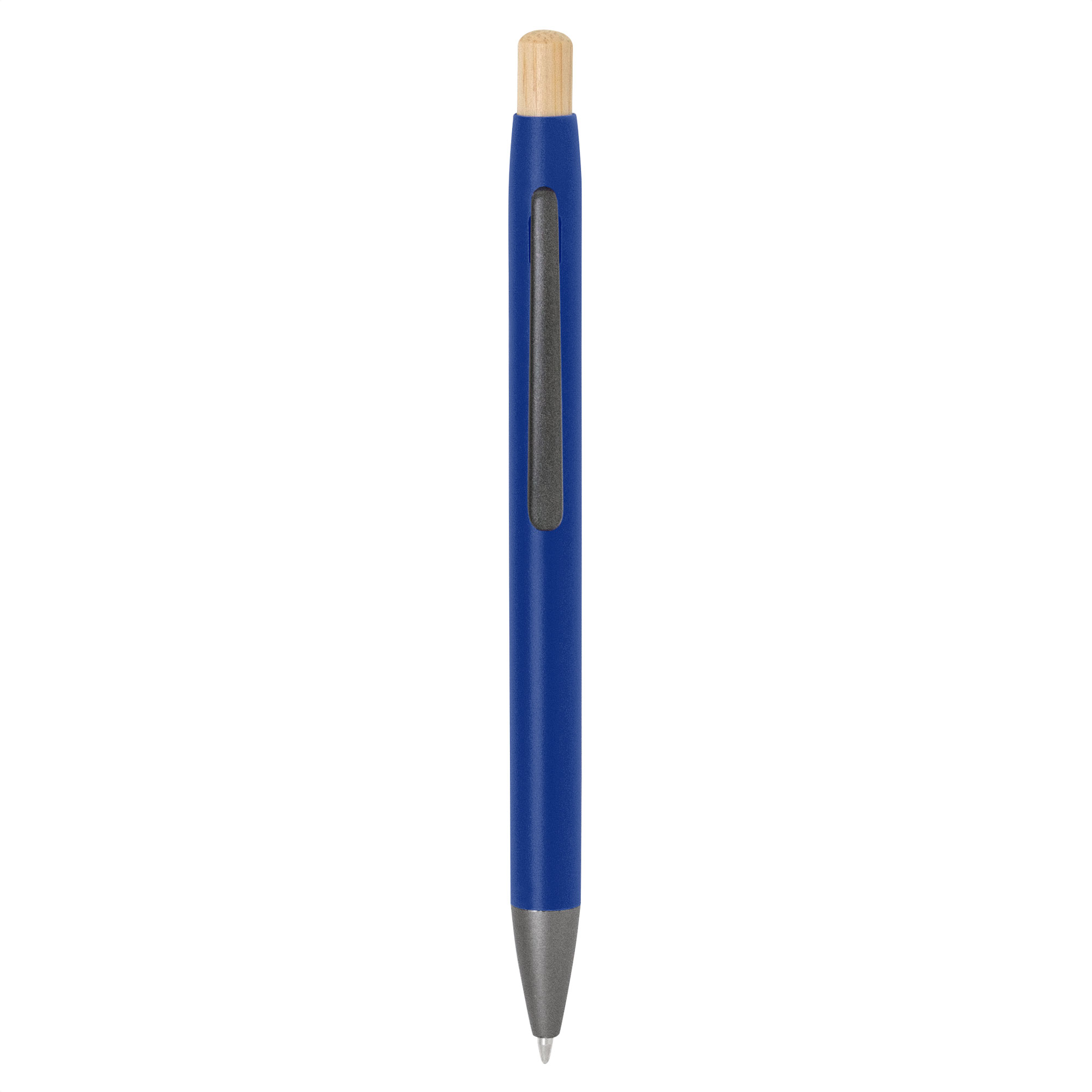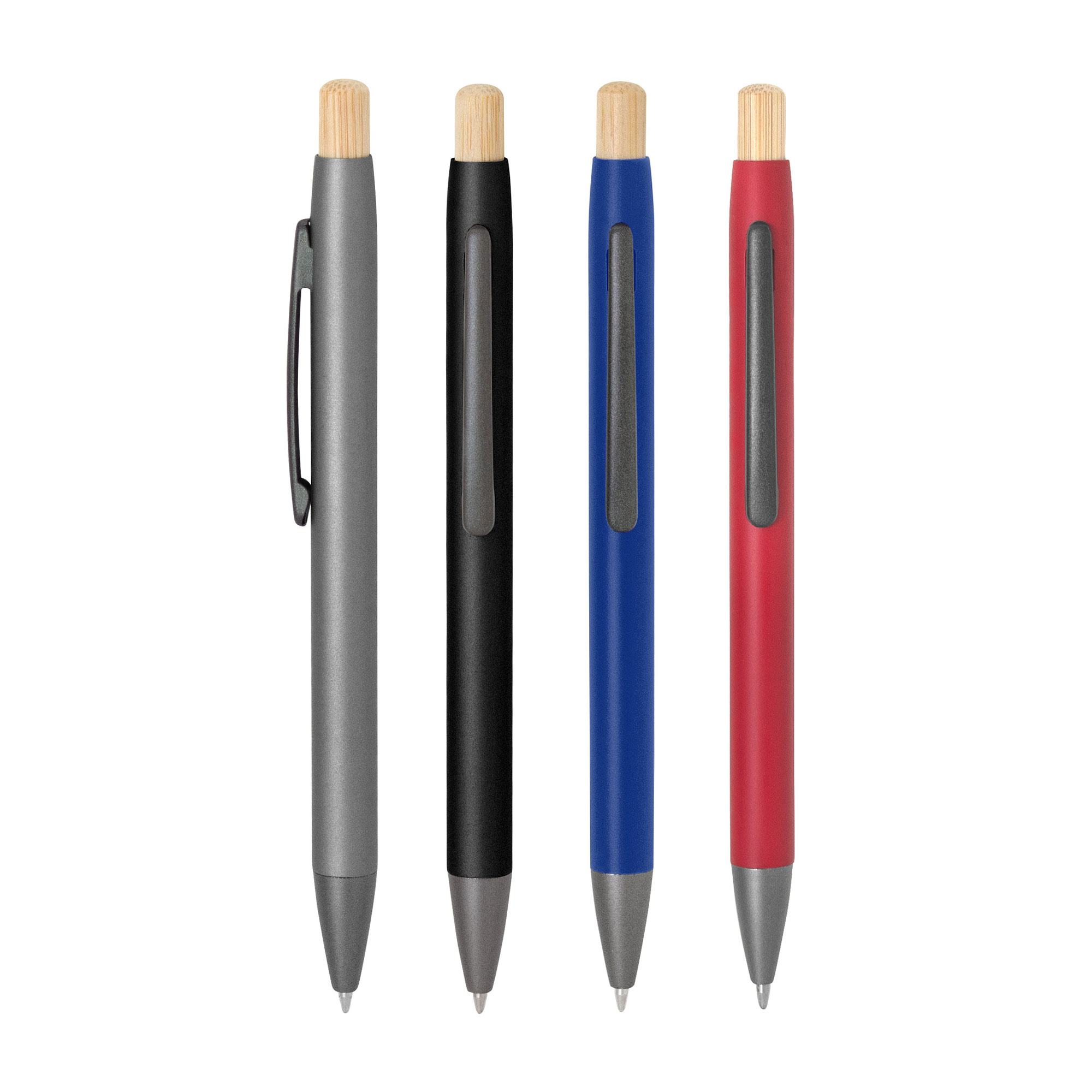 Bolígrafo retráctil. Cuerpo metálico en diferentes colores acabado mate. Clip metálico, puntera plástica color gris y pulsador de bambú.