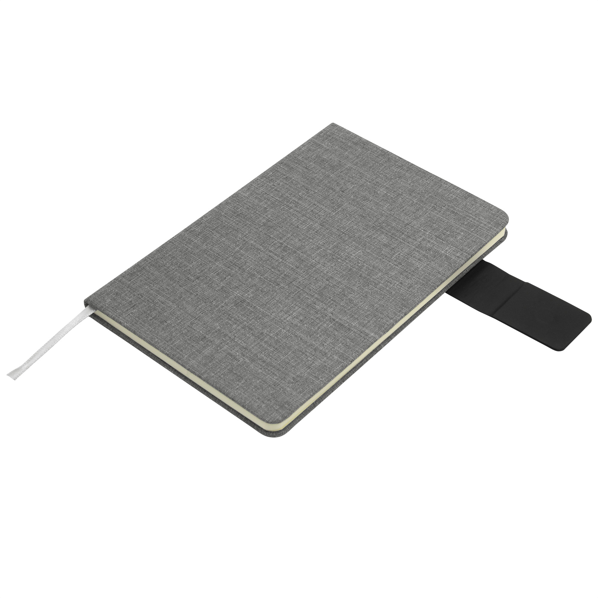 Libreta. Tapa de cartón de 1,8 mm recubierta en RPET color gris con tira de poliuretano color negro con cierre magnético. Interior de 80 hojas rayadas en papel obra crema de 70g. Encuadernación cosido. Incluye cinta señaladora del color de la tapa.